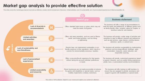 This slide covers the market gap analysis to provide an effective solution which includes lack of diversity, limited activities, lack of sustainability, lack of personalized experiences, limited accessibility, etc. Coming up with a presentation necessitates that the majority of the effort goes into the content and the message you intend to convey. The visuals of a PowerPoint presentation can only be effective if it supplements and supports the story that is being told. Keeping this in mind our experts created Spa Resort Business Plan Market Gap Analysis To Provide Effective Solution BP SS V to reduce the time that goes into designing the presentation. This way, you can concentrate on the message while our designers take care of providing you with the right template for the situation. This slide covers the market gap analysis to provide an effective solution which includes lack of diversity, limited activities, lack of sustainability, lack of personalized experiences, limited accessibility, etc.