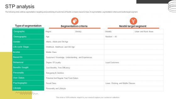 The following slide outlines segmentation, targeting and positioning of customers of Nestle company based on type of segmentation, segmentation criteria and nestle target segment. This Stp Analysis FMCG Provider Company Profile CP SS V from Slidegeeks makes it easy to present information on your topic with precision. It provides customization options, so you can make changes to the colors, design, graphics, or any other component to create a unique layout. It is also available for immediate download, so you can begin using it right away. Slidegeeks has done good research to ensure that you have everything you need to make your presentation stand out. Make a name out there for a brilliant performance. The following slide outlines segmentation, targeting and positioning of customers of Nestle company based on type of segmentation, segmentation criteria and nestle target segment.