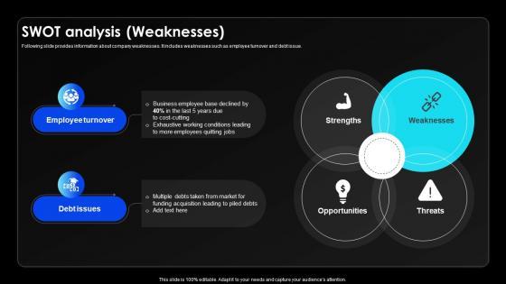 Following slide provides information about company weaknesses. It includes weaknesses such as employee turnover and debt issue.Slidegeeks is one of the best resources for PowerPoint templates. You can download easily and regulate Swot Analysis Weaknesses Wireless Communication Services Provider Company Profile CP SS V for your personal presentations from our wonderful collection. A few clicks is all it takes to discover and get the most relevant and appropriate templates. Use our Templates to add a unique zing and appeal to your presentation and meetings. All the slides are easy to edit and you can use them even for advertisement purposes. Following slide provides information about company weaknesses. It includes weaknesses such as employee turnover and debt issue.