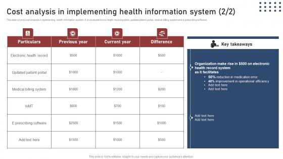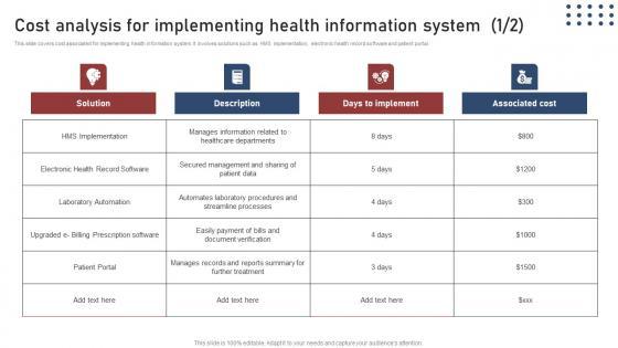 This slide covers cost associated for implementing health information system. It involves solutions such as HMS implementation, electronic health record software and patient portal. Get a simple yet stunning designed Cost Analysis For Implementing Transforming Medical Workflows Via His Integration Diagrams Pdf. It is the best one to establish the tone in your meetings. It is an excellent way to make your presentations highly effective. So, download this PPT today from Slidegeeks and see the positive impacts. Our easy to edit Cost Analysis For Implementing Transforming Medical Workflows Via His Integration Diagrams Pdf can be your go to option for all upcoming conferences and meetings. So, what are you waiting for Grab this template today. This slide covers cost associated for implementing health information system. It involves solutions such as HMS implementation, electronic health record software and patient portal.