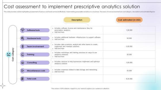 This slide provides a table highlighting assessment of various cost heads aimed at effectively implementing prescriptive analytics in a business. The basis of cost assessment are cost category, description and estimated figures.Retrieve professionally designed Cost Assessment To Implement Prescriptive Analytics Solution Data Analytics SS V to effectively convey your message and captivate your listeners. Save time by selecting pre-made slideshows that are appropriate for various topics, from business to educational purposes. These themes come in many different styles, from creative to corporate, and all of them are easily adjustable and can be edited quickly. Access them as PowerPoint templates or as Google Slides themes. You do not have to go on a hunt for the perfect presentation because Slidegeeks got you covered from everywhere. This slide provides a table highlighting assessment of various cost heads aimed at effectively implementing prescriptive analytics in a business. The basis of cost assessment are cost category, description and estimated figures.