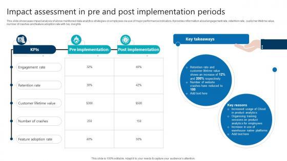 This slide showcases impact analysis of above mentioned data analytics strategies on employees via use of major performance indicators. It provides information about engagement rate, retention rate, customer lifetime value, number of crashes and feature adoption rate with key insights Explore a selection of the finest Impact Assessment In Pre And Post Implementation Periods Product Analytics Implementation Data Analytics V here. With a plethora of professionally designed and pre-made slide templates, you can quickly and easily find the right one for your upcoming presentation. You can use our Impact Assessment In Pre And Post Implementation Periods Product Analytics Implementation Data Analytics V to effectively convey your message to a wider audience. Slidegeeks has done a lot of research before preparing these presentation templates. The content can be personalized and the slides are highly editable. Grab templates today from Slidegeeks. This slide showcases impact analysis of above mentioned data analytics strategies on employees via use of major performance indicators. It provides information about engagement rate, retention rate, customer lifetime value, number of crashes and feature adoption rate with key insights