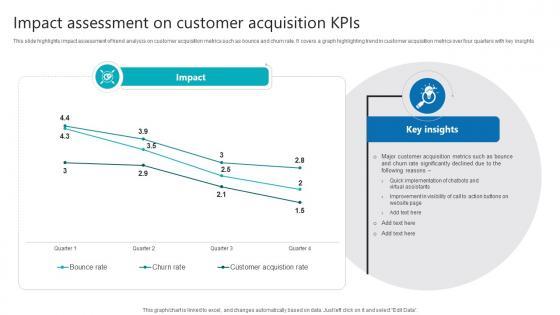This slide highlights impact assessment of trend analysis on customer acquisition metrics such as bounce and churn rate. It covers a graph highlighting trend in customer acquisition metrics over four quarters with key insights The Impact Assessment On Customer Acquisition Kpis Product Analytics Implementation Data Analytics V is a compilation of the most recent design trends as a series of slides. It is suitable for any subject or industry presentation, containing attractive visuals and photo spots for businesses to clearly express their messages. This template contains a variety of slides for the user to input data, such as structures to contrast two elements, bullet points, and slides for written information. Slidegeeks is prepared to create an impression. This slide highlights impact assessment of trend analysis on customer acquisition metrics such as bounce and churn rate. It covers a graph highlighting trend in customer acquisition metrics over four quarters with key insights
