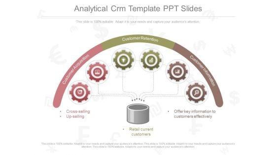 This is a analytical crm template ppt slides. This is a three stage process. The stages in this process are customer acquisition, customer retention, customer information, cross selling, up selling, retail current customers, offer key information to customers effectively.