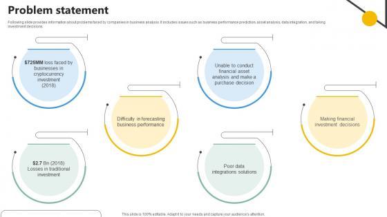 Following slide provides information about problems faced by companies in business analysis. It includes issues such as business performance prediction, asset analysis, data integration, and taking investment decisions. Make sure to capture your audiences attention in your business displays with our gratis customizable Financial Analytics Solution Investor Funding Elevator Pitch Deck Problem Statement Formats PDF. These are great for business strategies, office conferences, capital raising or task suggestions. If you desire to acquire more customers for your tech business and ensure they stay satisfied, create your own sales presentation with these plain slides.