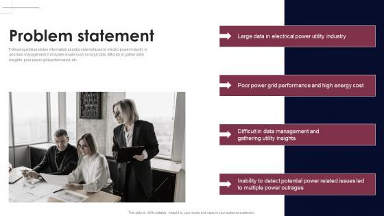 Following slide provides information about problems faced by electric power industry in grid data management. It includes issues such as large data, difficulty to gather utility insights, poor power grid performance, etc. Make sure to capture your audiences attention in your business displays with our gratis customizable Problem Statement Smart Grid Analytics Investor Fund Raising Inspiration PDF. These are great for business strategies, office conferences, capital raising or task suggestions. If you desire to acquire more customers for your tech business and ensure they stay satisfied, create your own sales presentation with these plain slides. Following slide provides information about problems faced by electric power industry in grid data management. It includes issues such as large data, difficulty to gather utility insights, poor power grid performance, etc.