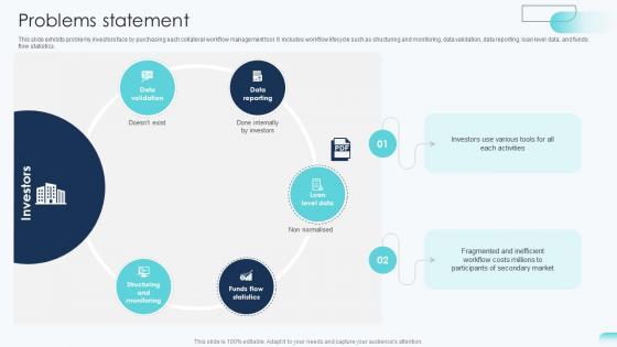 This slide exhibits problems investors face by purchasing each collateral workflow management tool. It includes workflow lifecycle such as structuring and monitoring, data validation, data reporting, loan level data, and funds flow statistics. Formulating a presentation can take up a lot of effort and time, so the content and message should always be the primary focus. The visuals of the PowerPoint can enhance the presenters message, so our Problems Statement Big Data Analytics Investor Funding Elevator Pitch Deck was created to help save time. Instead of worrying about the design, the presenter can concentrate on the message while our designers work on creating the ideal templates for whatever situation is needed. Slidegeeks has experts for everything from amazing designs to valuable content, we have put everything into Problems Statement Big Data Analytics Investor Funding Elevator Pitch Deck. This slide exhibits problems investors face by purchasing each collateral workflow management tool. It includes workflow lifecycle such as structuring and monitoring, data validation, data reporting, loan level data, and funds flow statistics.