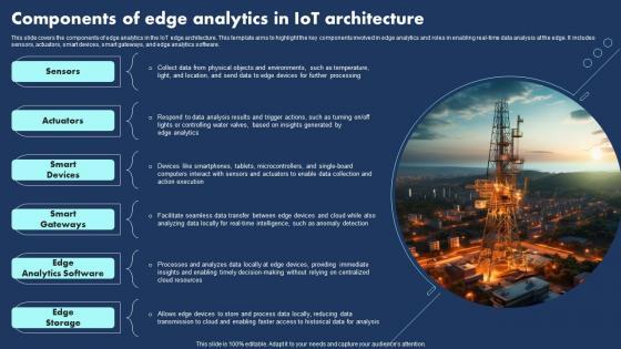 This slide covers the components of edge analytics in the IoT edge architecture. This template aims to highlight the key components involved in edge analytics and roles in enabling real time data analysis at the edge. It includes sensors, actuators, smart devices, smart gateways, and edge analytics software.Pitch your topic with ease and precision using this Components Of Edge Analytics In Iot Architecture Professional Pdf This layout presents information on Smart Gateways, Smart Devices, Analytics Software It is also available for immediate download and adjustment. So, changes can be made in the color, design, graphics or any other component to create a unique layout. This slide covers the components of edge analytics in the IoT edge architecture. This template aims to highlight the key components involved in edge analytics and roles in enabling real time data analysis at the edge. It includes sensors, actuators, smart devices, smart gateways, and edge analytics software.