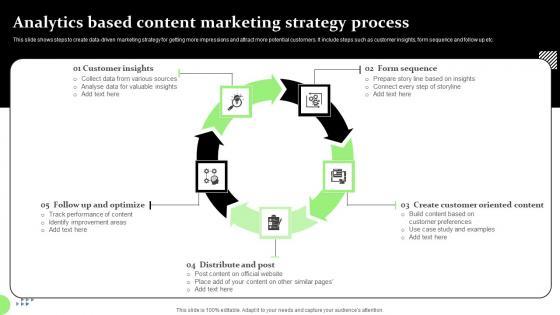 This slide shows steps to create data driven marketing strategy for getting more impressions and attract more potential customers. It include steps such as customer insights, form sequence and follow up etc this set of slides titled Analytics Based Content Marketing Strategy Process Professional Pdf The topics addressed in these templates are Customer Insights, Form Sequence, Customer Oriented Content All the content presented in this PPT design is completely editable. Download it and make adjustments in color, background, font etc. as per your unique business setting. This slide shows steps to create data driven marketing strategy for getting more impressions and attract more potential customers. It include steps such as customer insights, form sequence and follow up etc