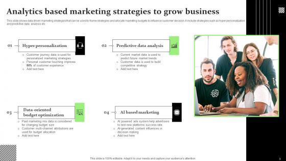 This slide shows data driven marketing strategies that can be used to frame strategies and allocate marketing budgets to influence customer decision. It include strategies such as hyper personalization and predictive data analysis etc.Showcasing this set of slides titled Analytics Based Marketing Strategies To Grow Business Themes Pdf The topics addressed in these templates are Hyper Personalization, Predictive Data Analysis, Budget Optimization All the content presented in this PPT design is completely editable. Download it and make adjustments in color, background, font etc. as per your unique business setting. This slide shows data driven marketing strategies that can be used to frame strategies and allocate marketing budgets to influence customer decision. It include strategies such as hyper personalization and predictive data analysis etc.