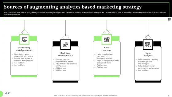 This slide shows main sources of augmenting data driven marketing strategy to check credibility of current policies and frame future policies. It include sources such as monitoring social media platforms, real time customer data and CRM systems etc.Showcasing this set of slides titled Sources Of Augmenting Analytics Based Marketing Strategy Infographics Pdf The topics addressed in these templates are Monitoring Social Platforms, Real Time Customer Data, Data Analytics All the content presented in this PPT design is completely editable. Download it and make adjustments in color, background, font etc. as per your unique business setting. This slide shows main sources of augmenting data driven marketing strategy to check credibility of current policies and frame future policies. It include sources such as monitoring social media platforms, real time customer data and CRM systems etc.