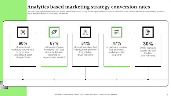 This slide shows significant conversion rates of using data driven marketing strategy to boost organizational sale and increase customer base. It include marketers priority percentage, marketing budget allocation percentage to data driven marketing etc.Pitch your topic with ease and precision using this Analytics Based Marketing Strategy Conversion Rates Ideas Pdf This layout presents information on Organizations Success, Driven Marketing, Organizational Pressure It is also available for immediate download and adjustment. So, changes can be made in the color, design, graphics or any other component to create a unique layout. This slide shows significant conversion rates of using data driven marketing strategy to boost organizational sale and increase customer base. It include marketers priority percentage, marketing budget allocation percentage to data driven marketing etc.