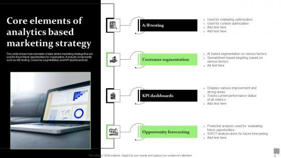 This slide shows main elements of data driven marketing strategy that are used to trace future opportunities for organization. It include components such as A B testing, Customer segmentation and KPI dashboards etc.Showcasing this set of slides titled Core Elements Of Analytics Based Marketing Strategy Infographics Pdf The topics addressed in these templates are Customer Segmentation, Opportunity Forecasting, Future Opportunities All the content presented in this PPT design is completely editable. Download it and make adjustments in color, background, font etc. as per your unique business setting. This slide shows main elements of data driven marketing strategy that are used to trace future opportunities for organization. It include components such as A B testing, Customer segmentation and KPI dashboards etc.