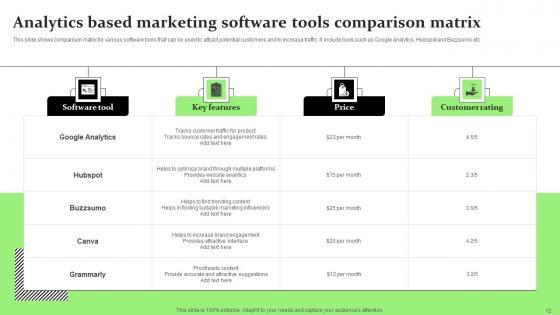 This slide shows comparison matrix for various software tools that can be used to attract potential customers and to increase traffic. It include tools such as Google analytics, Hubspot and Buzzsumo etcPitch your topic with ease and precision using this Analytics Based Marketing Software Tools Comparison Matrix Download Pdf This layout presents information on Attractive Suggestions, Proofreads Content, Attractive Interface It is also available for immediate download and adjustment. So, changes can be made in the color, design, graphics or any other component to create a unique layout. This slide shows comparison matrix for various software tools that can be used to attract potential customers and to increase traffic. It include tools such as Google analytics, Hubspot and Buzzsumo etc
