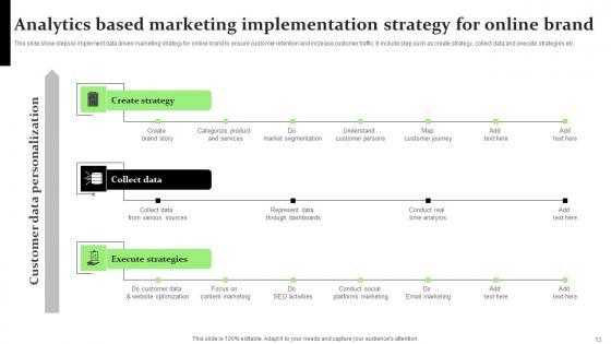 This slide show steps to implement data driven marketing strategy for online brand to ensure customer retention and increase customer traffic. It include step such as create strategy, collect data and execute strategies etc.Pitch your topic with ease and precision using this Analytics Based Marketing Implementation Strategy For Online Brand Topics Pdf This layout presents information on Market Segmentation, Understand Customer Persons, Map Customer Journey It is also available for immediate download and adjustment. So, changes can be made in the color, design, graphics or any other component to create a unique layout. This slide show steps to implement data driven marketing strategy for online brand to ensure customer retention and increase customer traffic. It include step such as create strategy, collect data and execute strategies etc.