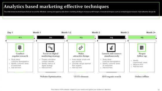 This slide shows key techniques that can be used for effectively running and applying data driven marketing strategy to increase profit margins. It include techniques such as conduct regular research, make attractive design etc.Showcasing this set of slides titled Analytics Based Marketing Effective Techniques Slides Pdf The topics addressed in these templates are Conduct Regular Research, Marketing Strategy, Make Attractive Design All the content presented in this PPT design is completely editable. Download it and make adjustments in color, background, font etc. as per your unique business setting. This slide shows key techniques that can be used for effectively running and applying data driven marketing strategy to increase profit margins. It include techniques such as conduct regular research, make attractive design etc.