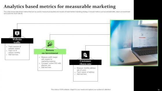 This slide shows data driven metrics that can be used to measure productivity and results of implemented marketing strategy. It include metrics such as website traffic, return on investment and customer churn rate etc.Pitch your topic with ease and precision using this Analytics Based Metrics For Measurable Marketing Guidelines Pdf This layout presents information on Website Traffic, Return Investment, Customer Churn Rate It is also available for immediate download and adjustment. So, changes can be made in the color, design, graphics or any other component to create a unique layout. This slide shows data driven metrics that can be used to measure productivity and results of implemented marketing strategy. It include metrics such as website traffic, return on investment and customer churn rate etc.