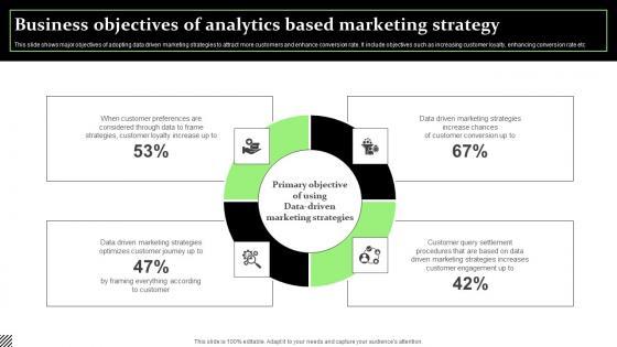 This slide shows major objectives of adopting data driven marketing strategies to attract more customers and enhance conversion rate. It include objectives such as increasing customer loyalty, enhancing conversion rate etc.Showcasing this set of slides titled Business Objectives Of Analytics Based Marketing Strategy Formats Pdf The topics addressed in these templates are Customer Preferences, Strategies Customer, Driven Marketing Strategies All the content presented in this PPT design is completely editable. Download it and make adjustments in color, background, font etc. as per your unique business setting. This slide shows major objectives of adopting data driven marketing strategies to attract more customers and enhance conversion rate. It include objectives such as increasing customer loyalty, enhancing conversion rate etc.