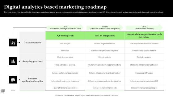 This slide shows three levels of digital data driven marketing strategy to analyse customer oriented data for increasing profit margins and ROI. It include section such as data driven tools, analysing practices and benefits etc.Showcasing this set of slides titled Digital Analytics Based Marketing Roadmap Elements Pdf The topics addressed in these templates are Analysing Practices, Data Driven Tools, Optimization Analysis All the content presented in this PPT design is completely editable. Download it and make adjustments in color, background, font etc. as per your unique business setting. This slide shows three levels of digital data driven marketing strategy to analyse customer oriented data for increasing profit margins and ROI. It include section such as data driven tools, analysing practices and benefits etc.