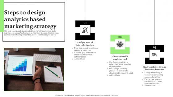 This slide show steps to design data driven marketing survey in order to improve weak areas of performance and plan new changes. It include steps such as analyse tracking area of data, choose suitable analytics tool etc.Pitch your topic with ease and precision using this Steps To Design Analytics Based Marketing Strategy Diagrams Pdf This layout presents information on Data Tracked, Analytics Tool, Business Decisions It is also available for immediate download and adjustment. So, changes can be made in the color, design, graphics or any other component to create a unique layout. This slide show steps to design data driven marketing survey in order to improve weak areas of performance and plan new changes. It include steps such as analyse tracking area of data, choose suitable analytics tool etc.