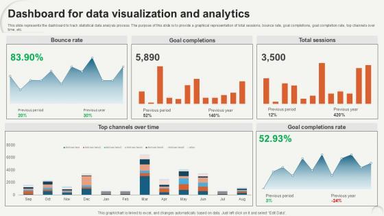 This slide represents the dashboard to track statistical data analysis process. The purpose of this slide is to provide a graphical representation of total sessions, bounce rate, goal completions, goal completion rate, top channels over time, etc. Are you in need of a template that can accommodate all of your creative concepts This one is crafted professionally and can be altered to fit any style. Use it with Google Slides or PowerPoint. Include striking photographs, symbols, depictions, and other visuals. Fill, move around, or remove text boxes as desired. Test out color palettes and font mixtures. Edit and save your work, or work with colleagues. Download Statistical Tools For Evidence Dashboard For Data Visualization And Analytics and observe how to make your presentation outstanding. Give an impeccable presentation to your group and make your presentation unforgettable. This slide represents the dashboard to track statistical data analysis process. The purpose of this slide is to provide a graphical representation of total sessions, bounce rate, goal completions, goal completion rate, top channels over time, etc.