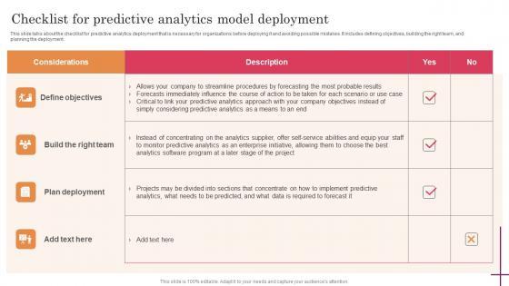 This slide talks about the checklist for predictive analytics deployment that is necessary for organizations before deploying it and avoiding possible mistakes. It includes defining objectives, building the right team, and planning the deployment.This Predictive Analytics Methods Checklist For Predictive Analytics Model Deployment Mockup PDF from Slidegeeks makes it easy to present information on your topic with precision. It provides customization options, so you can make changes to the colors, design, graphics, or any other component to create a unique layout. It is also available for immediate download, so you can begin using it right away. Slidegeeks has done good research to ensure that you have everything you need to make your presentation stand out. Make a name out there for a brilliant performance.