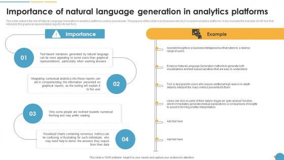 This slide outlines the role of Natural Language Generation in analytics platforms used by businesses. The purpose of this slide is to showcase why NLG is used in analytics platforms. It also includes the example of a BI tool that interprets the graphical representation reports into text form. Explore a selection of the finest Importance Of Natural Language Generation In Analytics Platforms Natural Language Automation here. With a plethora of professionally designed and pre-made slide templates, you can quickly and easily find the right one for your upcoming presentation. You can use our Importance Of Natural Language Generation In Analytics Platforms Natural Language Automation to effectively convey your message to a wider audience. Slidegeeks has done a lot of research before preparing these presentation templates. The content can be personalized and the slides are highly editable. Grab templates today from Slidegeeks. This slide outlines the role of Natural Language Generation in analytics platforms used by businesses. The purpose of this slide is to showcase why NLG is used in analytics platforms. It also includes the example of a BI tool that interprets the graphical representation reports into text form.