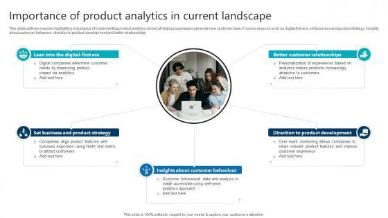 This slide outlines reasons highlighting importance of implementing product analytics aimed at helping businesses generate new customer base. It covers reasons such as digital-first era, set business and product strategy, insights about customer behaviour, direction to product development and better relationships Slidegeeks has constructed Importance Of Product Analytics In Current Landscape Product Analytics Implementation Data Analytics V after conducting extensive research and examination. These presentation templates are constantly being generated and modified based on user preferences and critiques from editors. Here, you will find the most attractive templates for a range of purposes while taking into account ratings and remarks from users regarding the content. This is an excellent jumping-off point to explore our content and will give new users an insight into our top-notch PowerPoint Templates. This slide outlines reasons highlighting importance of implementing product analytics aimed at helping businesses generate new customer base. It covers reasons such as digital-first era, set business and product strategy, insights about customer behaviour, direction to product development and better relationships
