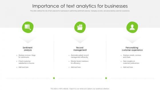This slide outlines the role of text analysis for businesses in performing sentiment analysis, managing records, and personalizing customer experience. This Importance Of Text Analytics For Businesses PPT Presentation SS is perfect for any presentation, be it in front of clients or colleagues. It is a versatile and stylish solution for organizing your meetings. The Importance Of Text Analytics For Businesses PPT Presentation SS features a modern design for your presentation meetings. The adjustable and customizable slides provide unlimited possibilities for acing up your presentation. Slidegeeks has done all the homework before launching the product for you. So, do not wait, grab the presentation templates today This slide outlines the role of text analysis for businesses in performing sentiment analysis, managing records, and personalizing customer experience.