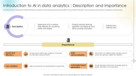 This slide provides an introduction to artificial intelligence in analytics aimed ta helping businesses derive patterns and connections in the data. It covers description and importance of integrating machine learning.Create an editable Introduction To Ai In Data Analytics Description And Importance Data Analytics SS V that communicates your idea and engages your audience. Whether you are presenting a business or an educational presentation, pre-designed presentation templates help save time. Introduction To Ai In Data Analytics Description And Importance Data Analytics SS V is highly customizable and very easy to edit, covering many different styles from creative to business presentations. Slidegeeks has creative team members who have crafted amazing templates. So, go and get them without any delay. This slide provides an introduction to artificial intelligence in analytics aimed ta helping businesses derive patterns and connections in the data. It covers description and importance of integrating machine learning.