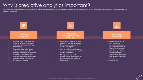 This slide depicts the importance of predictive analytics in different industries. It includes the rise of big data, using cutting-edge technologies for big data and machine learning to extract meaningful insights and increasing competition. If your project calls for a presentation, then Slidegeeks is your go-to partner because we have professionally designed, easy-to-edit templates that are perfect for any presentation. After downloading, you can easily edit Why Is Predictive Analytics Important Predictive Analytics For Improved Guidelines Pdf and make the changes accordingly. You can rearrange slides or fill them with different images. Check out all the handy templates This slide depicts the importance of predictive analytics in different industries. It includes the rise of big data, using cutting-edge technologies for big data and machine learning to extract meaningful insights and increasing competition.