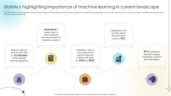 This slide outlines various statistical facts signifying importance of implementing machine learning algorithms in current business landscape. It covers facts regarding Amazon, business analytics, installation rate, drug discovery cost and ongoing investments.Do you know about Slidesgeeks Statistics Highlighting Importance Of Machine Learning In Current Landscape Data Analytics SS V These are perfect for delivering any kind od presentation. Using it, create PowerPoint presentations that communicate your ideas and engage audiences. Save time and effort by using our pre-designed presentation templates that are perfect for a wide range of topic. Our vast selection of designs covers a range of styles, from creative to business, and are all highly customizable and easy to edit. Download as a PowerPoint template or use them as Google Slides themes. This slide outlines various statistical facts signifying importance of implementing machine learning algorithms in current business landscape. It covers facts regarding Amazon, business analytics, installation rate, drug discovery cost and ongoing investments.
