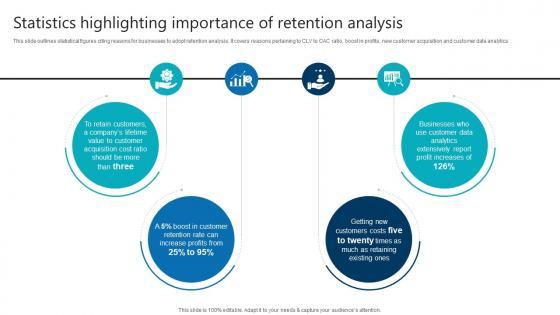 This slide outlines statistical figures citing reasons for businesses to adopt retention analysis. It covers reasons pertaining to CLV to CAC ratio, boost in profits, new customer acquisition and customer data analyticsAre you in need of a template that can accommodate all of your creative concepts This one is crafted professionally and can be altered to fit any style. Use it with Google Slides or PowerPoint. Include striking photographs, symbols, depictions, and other visuals. Fill, move around, or remove text boxes as desired. Test out color palettes and font mixtures. Edit and save your work, or work with colleagues. Download Statistics Highlighting Importance Of Retention Analysis Product Analytics Implementation Data Analytics V and observe how to make your presentation outstanding. Give an impeccable presentation to your group and make your presentation unforgettable. This slide outlines statistical figures citing reasons for businesses to adopt retention analysis. It covers reasons pertaining to CLV to CAC ratio, boost in profits, new customer acquisition and customer data analytics