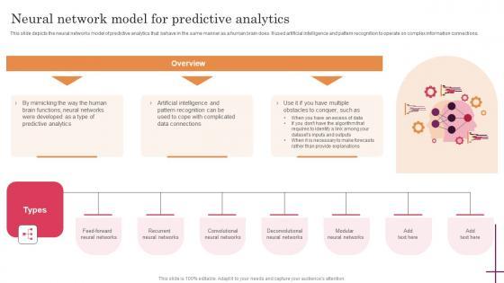 This slide depicts the neural networks model of predictive analytics that behave in the same manner as a human brain does. It used artificial intelligence and pattern recognition to operate on complex information connections. Slidegeeks is here to make your presentations a breeze with Predictive Analytics For Empowering Neural Network Model For Predictive Analytics Pictures Pdf With our easy-to-use and customizable templates, you can focus on delivering your ideas rather than worrying about formatting. With a variety of designs to choose from, you are sure to find one that suits your needs. And with animations and unique photos, illustrations, and fonts, you can make your presentation pop. So whether you are giving a sales pitch or presenting to the board, make sure to check out Slidegeeks first. This slide depicts the neural networks model of predictive analytics that behave in the same manner as a human brain does. It used artificial intelligence and pattern recognition to operate on complex information connections.