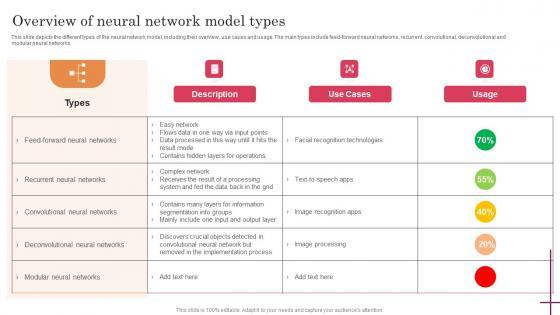 This slide depicts the different types of the neural network model, including their overview, use cases and usage. The main types include feed-forward neural networks, recurrent, convolutional, deconvolutional and modular neural networks. If your project calls for a presentation, then Slidegeeks is your go-to partner because we have professionally designed, easy-to-edit templates that are perfect for any presentation. After downloading, you can easily edit Overview Of Neural Network Model Types Predictive Analytics For Improved Sample Pdf and make the changes accordingly. You can rearrange slides or fill them with different images. Check out all the handy templates This slide depicts the different types of the neural network model, including their overview, use cases and usage. The main types include feed-forward neural networks, recurrent, convolutional, deconvolutional and modular neural networks.