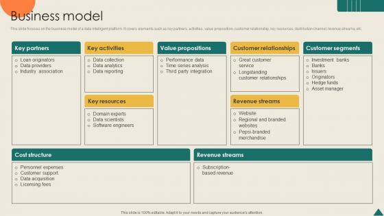 This slide focuses on the business model of a data intelligent platform. It covers elements such as key partners, activities, value proposition, customer relationship, key resources, distribution channel, revenue streams, etc. Are you searching for a Business Model Financial Analytics Platform Investor Elevator Pitch Deck that is uncluttered, straightforward, and original Its easy to edit, and you can change the colors to suit your personal or business branding. For a presentation that expresses how much effort you have put in, this template is ideal With all of its features, including tables, diagrams, statistics, and lists, its perfect for a business plan presentation. Make your ideas more appealing with these professional slides. Download Business Model Financial Analytics Platform Investor Elevator Pitch Deck from Slidegeeks today. This slide focuses on the business model of a data intelligent platform. It covers elements such as key partners, activities, value proposition, customer relationship, key resources, distribution channel, revenue streams, etc.