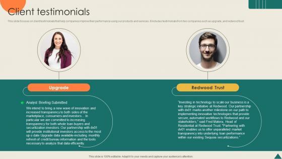 This slide focuses on client testimonials that help companies improve their performance using our products and services. It includes testimonials from two companies such as upgrade, and redwood trust. Retrieve professionally designed Client Testimonials Financial Analytics Platform Investor Elevator Pitch Deck to effectively convey your message and captivate your listeners. Save time by selecting pre-made slideshows that are appropriate for various topics, from business to educational purposes. These themes come in many different styles, from creative to corporate, and all of them are easily adjustable and can be edited quickly. Access them as PowerPoint templates or as Google Slides themes. You do not have to go on a hunt for the perfect presentation because Slidegeeks got you covered from everywhere. This slide focuses on client testimonials that help companies improve their performance using our products and services. It includes testimonials from two companies such as upgrade, and redwood trust.