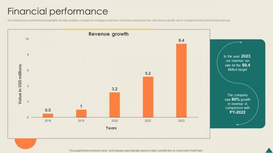 This slide focuses on the financial highlights of a data analytics company for mortgages and loans. It includes revenue per year, and revenue growth rate in comparison to the previous financial year. Find a pre-designed and impeccable Financial Performance Financial Analytics Platform Investor Elevator Pitch Deck. The templates can ace your presentation without additional effort. You can download these easy-to-edit presentation templates to make your presentation stand out from others. So, what are you waiting for Download the template from Slidegeeks today and give a unique touch to your presentation. This slide focuses on the financial highlights of a data analytics company for mortgages and loans. It includes revenue per year, and revenue growth rate in comparison to the previous financial year.
