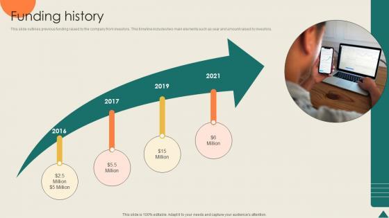This slide outlines previous funding raised by the company from investors. This timeline includes two main elements such as year and amount raised by investors. Create an editable Funding History Financial Analytics Platform Investor Elevator Pitch Deck that communicates your idea and engages your audience. Whether you are presenting a business or an educational presentation, pre-designed presentation templates help save time. Funding History Financial Analytics Platform Investor Elevator Pitch Deck is highly customizable and very easy to edit, covering many different styles from creative to business presentations. Slidegeeks has creative team members who have crafted amazing templates. So, go and get them without any delay. This slide outlines previous funding raised by the company from investors. This timeline includes two main elements such as year and amount raised by investors.