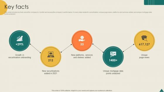 This slide includes key facts about the company to monitor and assess the companys performance. It covers data related to securitization, unique page views, platforms and services added, and unique mortgage data points analyzed. There are so many reasons you need a Key Facts Financial Analytics Platform Investor Elevator Pitch Deck. The first reason is you can not spend time making everything from scratch, Thus, Slidegeeks has made presentation templates for you too. You can easily download these templates from our website easily. This slide includes key facts about the company to monitor and assess the companys performance. It covers data related to securitization, unique page views, platforms and services added, and unique mortgage data points analyzed.