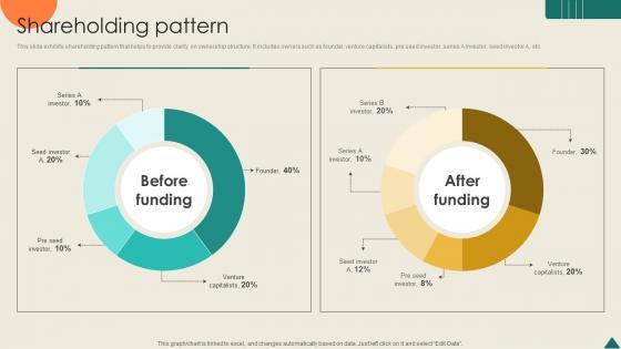 This slide exhibits shareholding pattern that helps to provide clarity on ownership structure. It includes owners such as founder, venture capitalists, pre seed investor, series A investor, seed investor A, etc. Find highly impressive Shareholding Pattern Financial Analytics Platform Investor Elevator Pitch Deck on Slidegeeks to deliver a meaningful presentation. You can save an ample amount of time using these presentation templates. No need to worry to prepare everything from scratch because Slidegeeks experts have already done a huge research and work for you. You need to download Shareholding Pattern Financial Analytics Platform Investor Elevator Pitch Deck for your upcoming presentation. All the presentation templates are 100 percent editable and you can change the color and personalize the content accordingly. Download now This slide exhibits shareholding pattern that helps to provide clarity on ownership structure. It includes owners such as founder, venture capitalists, pre seed investor, series A investor, seed investor A, etc.