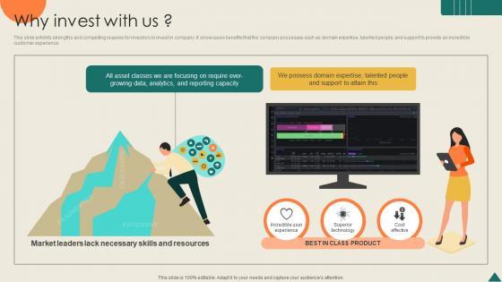 This slide exhibits strengths and compelling reasons for investors to invest in company. It showcases benefits that the company possesses such as domain expertise, talented people, and support to provide an incredible customer experience. Are you in need of a template that can accommodate all of your creative concepts This one is crafted professionally and can be altered to fit any style. Use it with Google Slides or PowerPoint. Include striking photographs, symbols, depictions, and other visuals. Fill, move around, or remove text boxes as desired. Test out color palettes and font mixtures. Edit and save your work, or work with colleagues. Download Why Invest With Us Financial Analytics Platform Investor Elevator Pitch Deck and observe how to make your presentation outstanding. Give an impeccable presentation to your group and make your presentation unforgettable. This slide exhibits strengths and compelling reasons for investors to invest in company. It showcases benefits that the company possesses such as domain expertise, talented people, and support to provide an incredible customer experience.