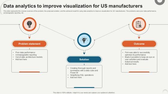 This slide represents the concise overview of the problem, the proposed solution, and the achieved result for using data analytics to improve visualization for US manufacturers. The problems were poor data performance, unmanageable reporting, etc. Whether you have daily or monthly meetings, a brilliant presentation is necessary. Data Analytics To Improve Visualization Data Analytics For Informed Decision Ppt PowerPoint can be your best option for delivering a presentation. Represent everything in detail using Data Analytics To Improve Visualization Data Analytics For Informed Decision Ppt PowerPoint and make yourself stand out in meetings. The template is versatile and follows a structure that will cater to your requirements. All the templates prepared by Slidegeeks are easy to download and edit. Our research experts have taken care of the corporate themes as well. So, give it a try and see the results. This slide represents the concise overview of the problem, the proposed solution, and the achieved result for using data analytics to improve visualization for US manufacturers. The problems were poor data performance, unmanageable reporting, etc.
