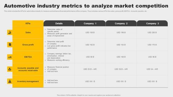 This slide includes the KPIs for automotive industry to measure and enhance financial performance of the company. Thus includes various KPIs like sales, gross profit, EBITDA, Accounts payable, etc. Showcasing this set of slides titled Automotive Industry Metrics To Analyze Market Competition Summary Pdf. The topics addressed in these templates are Gross Profit, Inventory Management, Sales. All the content presented in this PPT design is completely editable. Download it and make adjustments in color, background, font etc. as per your unique business setting. This slide includes the KPIs for automotive industry to measure and enhance financial performance of the company. Thus includes various KPIs like sales, gross profit, EBITDA, Accounts payable, etc.