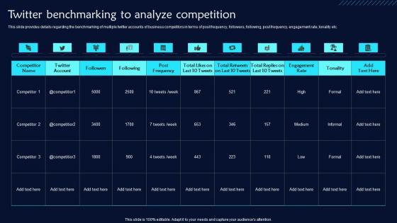 This slide provides details regarding the benchmarking of multiple twitter accounts of business competitors in terms of post frequency, followers, following, post frequency, engagement rate, tonality etc. If your project calls for a presentation, then Slidegeeks is your go-to partner because we have professionally designed, easy-to-edit templates that are perfect for any presentation. After downloading, you can easily edit Utilizing Twitter For Social Media Twitter Benchmarking To Analyze Competition Ideas PDF and make the changes accordingly. You can rearrange slides or fill them with different images. Check out all the handy templates