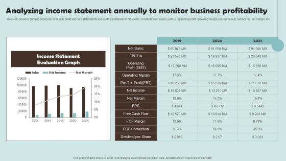 This slide provides glimpse about year over year profit and loss statement to assess the profitability of Nestle SA. It includes net sales, EBITDA, operating profit, operating margin, pre-tax benefit, net income, net margin, etc. Do you have to make sure that everyone on your team knows about any specific topic I yes, then you should give Packaged Food Business Analyzing Income Statement Annually To Monitor Graphics Pdf a try. Our experts have put a lot of knowledge and effort into creating this impeccable Packaged Food Business Analyzing Income Statement Annually To Monitor Graphics Pdf You can use this template for your upcoming presentations, as the slides are perfect to represent even the tiniest detail. You can download these templates from the Slidegeeks website and these are easy to edit. So grab these today This slide provides glimpse about year over year profit and loss statement to assess the profitability of Nestle SA. It includes net sales, EBITDA, operating profit, operating margin, pre-tax benefit, net income, net margin, etc.
