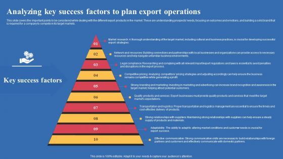 This slide covers the important points to be considered while dealing with the different export products in the market. These are understanding prospects needs, focusing on outcomes and emotions, and building a solid brand that is required for a company to compete in its target markets. Create an editable Analyzing Key Success Factors To Plan Export Operations Export Business Plan Mockup Pdf that communicates your idea and engages your audience. Whether you are presenting a business or an educational presentation, pre-designed presentation templates help save time. Analyzing Key Success Factors To Plan Export Operations Export Business Plan Mockup Pdf is highly customizable and very easy to edit, covering many different styles from creative to business presentations. Slidegeeks has creative team members who have crafted amazing templates. So, go and get them without any delay. This slide covers the important points to be considered while dealing with the different export products in the market. These are understanding prospects needs, focusing on outcomes and emotions, and building a solid brand that is required for a company to compete in its target markets.