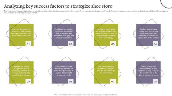 This slide covers the essential points to be considered while selling shoefootwear products in the market. These are understanding prospects needs, focusing on outcomes and emotions, and building a solid brand that is required for a company to compete in its target markets. Here you can discover an assortment of the finest PowerPoint and Google Slides templates. With these templates, you can create presentations for a variety of purposes while simultaneously providing your audience with an eye catching visual experience. Download Analyzing Key Success Factors To Strategize Company Analysis Of Shoe Store Pictures Pdf to deliver an impeccable presentation. These templates will make your job of preparing presentations much quicker, yet still, maintain a high level of quality. Slidegeeks has experienced researchers who prepare these templates and write high quality content for you. Later on, you can personalize the content by editing the Analyzing Key Success Factors To Strategize Company Analysis Of Shoe Store Pictures Pdf. This slide covers the essential points to be considered while selling shoefootwear products in the market. These are understanding prospects needs, focusing on outcomes and emotions, and building a solid brand that is required for a company to compete in its target markets.