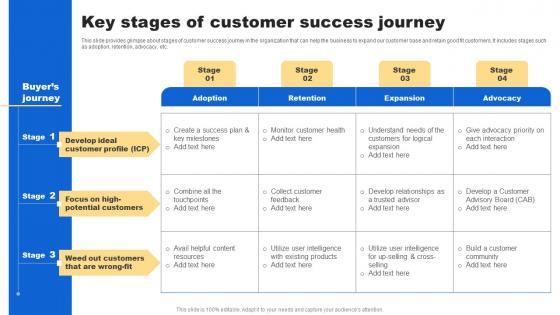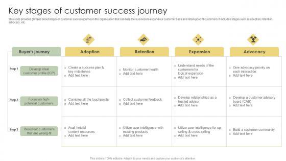 This slide provides glimpse about stages of customer success journey in the organization that can help the business to expand our customer base and retain good fit customers. It includes stages such as adoption, retention, advocacy, etc.Are you in need of a template that can accommodate all of your creative concepts This one is crafted professionally and can be altered to fit any style. Use it with Google Slides or PowerPoint. Include striking photographs, symbols, depictions, and other visuals. Fill, move around, or remove text boxes as desired. Test out color palettes and font mixtures. Edit and save your work, or work with colleagues. Download Key Stages Of Customer Success Journey Analyzing Customer Adoption Journey To Information Pdf and observe how to make your presentation outstanding. Give an impeccable presentation to your group and make your presentation unforgettable. This slide provides glimpse about stages of customer success journey in the organization that can help the business to expand our customer base and retain good fit customers. It includes stages such as adoption, retention, advocacy, etc.