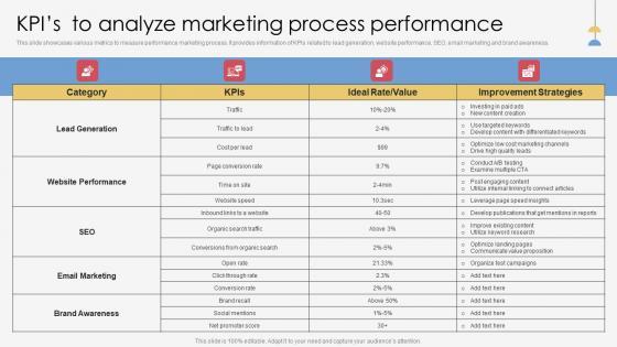 This slide showcases various metrics to measure performance marketing process. It provides information of KPIs related to lead generation, website performance, SEO, email marketing and brand awareness. Get a simple yet stunning designed Marketing Process Execution For Successful Promotion KPIs To Analyze Marketing Template Pdf. It is the best one to establish the tone in your meetings. It is an excellent way to make your presentations highly effective. So, download this PPT today from Slidegeeks and see the positive impacts. Our easy to edit Marketing Process Execution For Successful Promotion KPIs To Analyze Marketing Template Pdf can be your go to option for all upcoming conferences and meetings. So, what are you waiting for Grab this template today. This slide showcases various metrics to measure performance marketing process. It provides information of KPIs related to lead generation, website performance, SEO, email marketing and brand awareness.